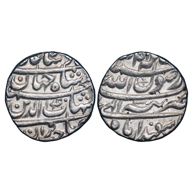 | Shah Jahan I (AH 1037-1068/1628-1658 AD), Silver Rupee, 11.42g, Tatta Mint, AH 1040/3 RY, Ilahi Month Isfandarmuz, Obv : The Kalima at the top in two lines "zarb Tatta" with RY 3 , Elahi Isfandarmuz Mah at the bottom , Rev: Saheb-e-qiran Sani Shihab ud din Muhammad Shahjahan Badshah Ghazi with 1040 Hijri year, without test mark, Superb bold strike, Almost uncirculated.Rare. |