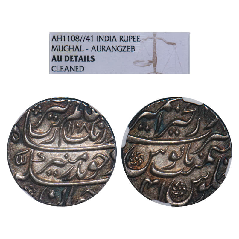 Aurangzeb, Silver Rupee, Dar ul Khair Ajmer Mint, AH 1108/41 RY. KM 300.5. NGC graded AU Details cleaned, Scarce.