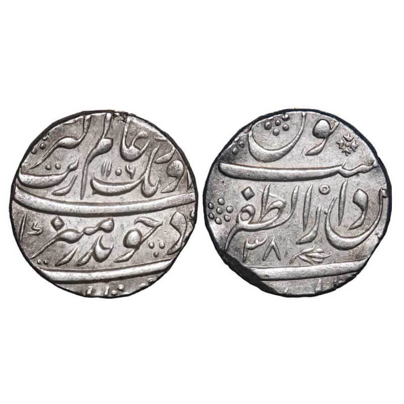 Aurangzeb, Silver Rupee, 11.37g, Dar ul Zafar Bijapur Mint, AH 1106/38 RY, with flower symbol on reverse. KM 300.23. About Extremely Fine, Scarce.