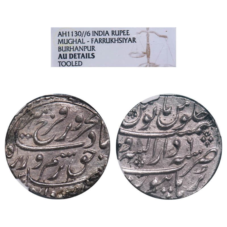 Farrukhsiyar, Silver Rupee, Dar us sarur Burhanpur Mint, AH 1130/6 RY. KM 377.22. NGC graded AU Details Tooled, Scarce.