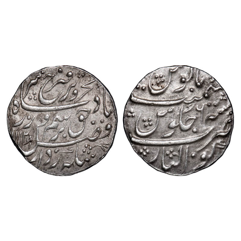 Farrukhsiyar, Silver Rupee, 11.39g, Gwalior Mint,AH 1129/6 RY. partial dotted borders seen both sides, broad flan. KM 377.30. About Extremely Fine, Scarce.