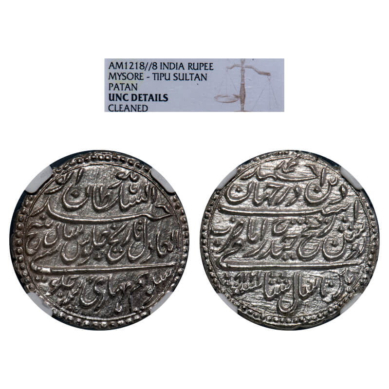 Mysore, Silver Rupee, Tipu Sultan, Patan Mint, AH 1218/8 RY. KM 126/Henderson 56. NGC graded UNC Details cleaned. Rare.