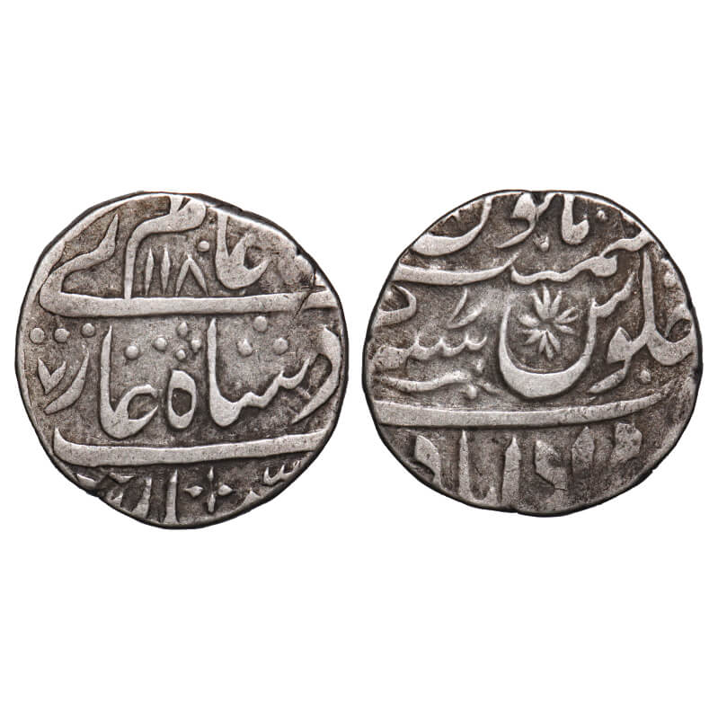 Rohilkhand, Silver Rupee, 11.18g. Muradabad Mint, Nawab Dunde Khan Bahadur (AH 1166 - 1187/ 1752 - 1771 AD) INO Shah Alam II, AH 1180/7 RY, Additional Persian Digit 7 on obverse within middle line, Flower Symbols & Sunbrust with noon Mint in bottom Zarb Muradabad. KM 76.6 type. Very Fine, Scarce.