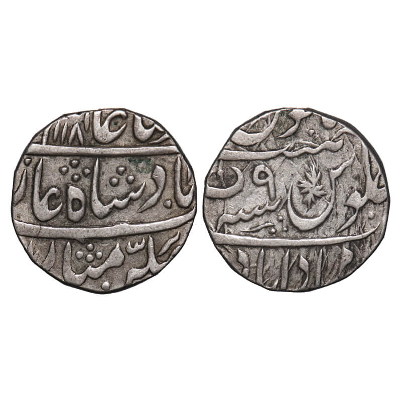 | Rohilkhand, Silver Rupee, 11.17g, Muradabad Mint, reconditioned die strikes on reverse , Nawab Dunde Khan Bahadur (AH 1166 - 1187/ 1752 - 1771 AD) INO Shah Alam II, AH 1181/9 RY, Flower symbols with noon, Mint in bottom Muradabad. KM 76.6, Very Fine, Scarce. |