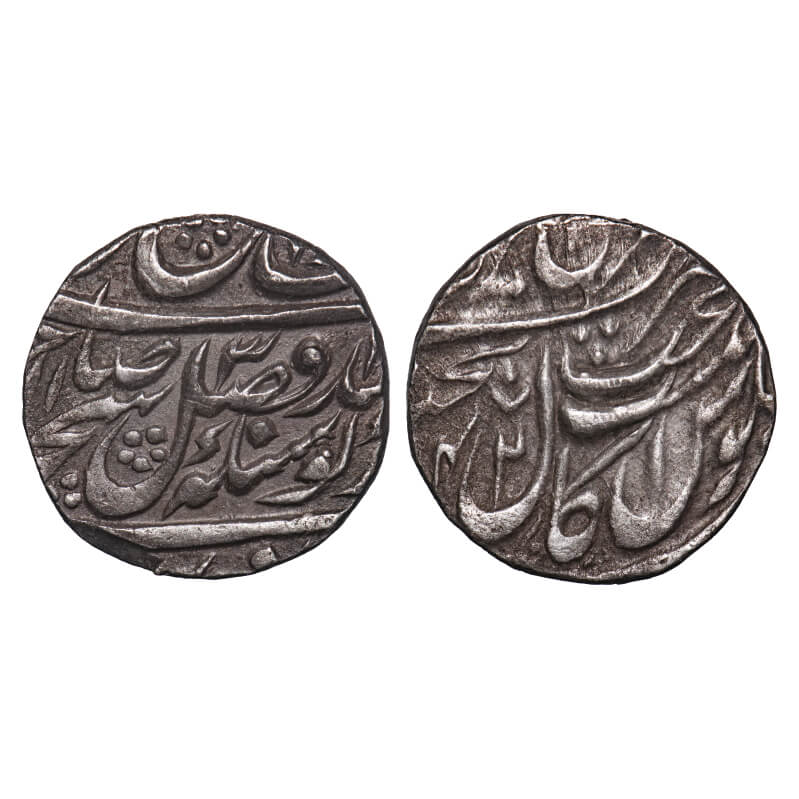 | Sikh Empire ,Silver Rupee, 11.10g, Sikhs (Misls), Gulab Singh (VS 1839-1857, 1782-1800 AD), Amritsar Mint, "Nanakshahi" couplet, VS (18)42, Guru Nanak Era 31x, signifying the number of years from the birth of Guru Nanak Ji, 31(6) in small numerals on the obverse, Sikka zad bar har do alam fazl sacha sahib ast; Fath tegh e Guru Gobind Singh Shah Nanak Wahib ast. GS 01.08.01 types/S S Sidhu & D Singh / spink page 20. Toned About Extremely Fine, Rare. |