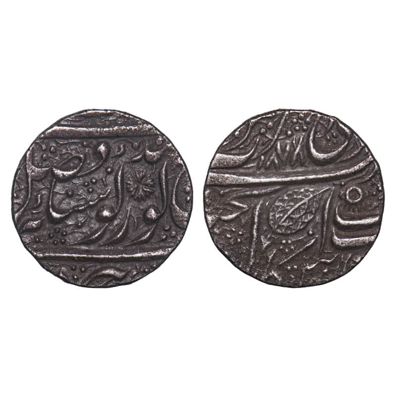 | Sikh Empire, Silver Rupee, 10.93g, Ranjit Singh (VS 1856 - 1896 / 1799 - 1839 AD), Sri Amritsar Mint, Nanak Shahi Couplet, VS 1878 (8 over 7), clear traces of '7' under '8' (1821AD), struck from re-engraved die of previous year VS 1877 last digit of date '7' re-engraved to '8' for striking coins of year VS 1878 from previous year VS 1877 die, instead of making a new die from unknown reasons, 18 Pointed Star / Aarsi Like symbol below bind on Obv. Lion Face Like Symbol Above Takht, a Prominent Rosette / Flower Below Leaf above 'Ka' of Akal on rev, Note - This is a rare phenomenon in Sikh Empire single date coinage , suggesting the utilization of the previous year's die for the next year. No test mark. . broad Flan, Toned, Very Fine+. Very Rare. |