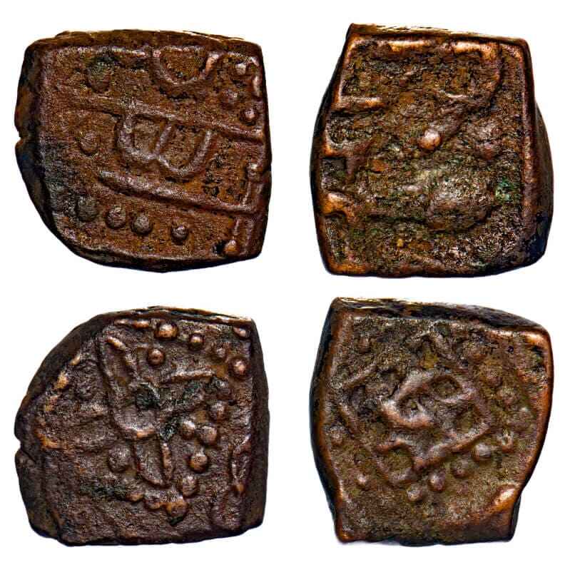 Dhar, Copper Kachha Paisa (2 Coins), 10.53 & 11.59g, over struck type, Obv: Geometricaly designed box (may be Chess Board) and other flower with box, Rev: sword. KM Unlisted. About Very Fine, Scarce.