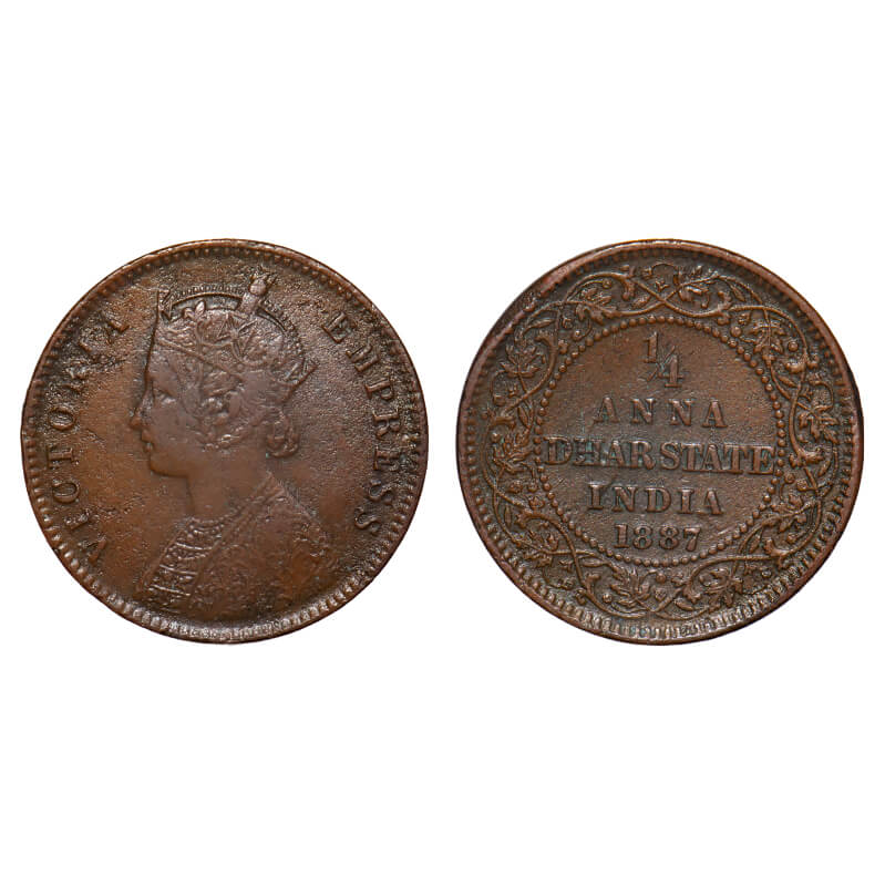 Dhar, Copper ¼ Anna, 6.34g, Anand Rao III (1860-1898 AD), 1887 AD, bust of Victoria Empress on obv. KM 13. Very Fine+, Scarce.