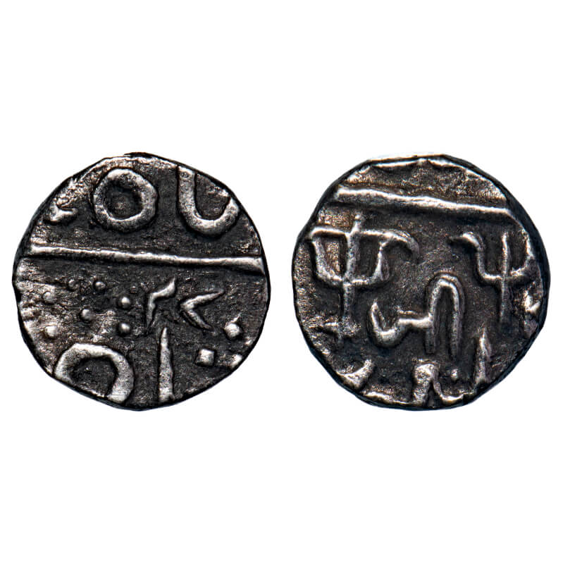 | Gwalior, 1/2 Rupee, 5.15g, Jayaji Rao (1843-1886 AD), Bhilsa Mint. AH (12)27, with Bow and Arrow, Trident, and Nagar 'Ji', KM Unlisted 27 type unlisted denomination. Toned Very Fine+, Rare. |