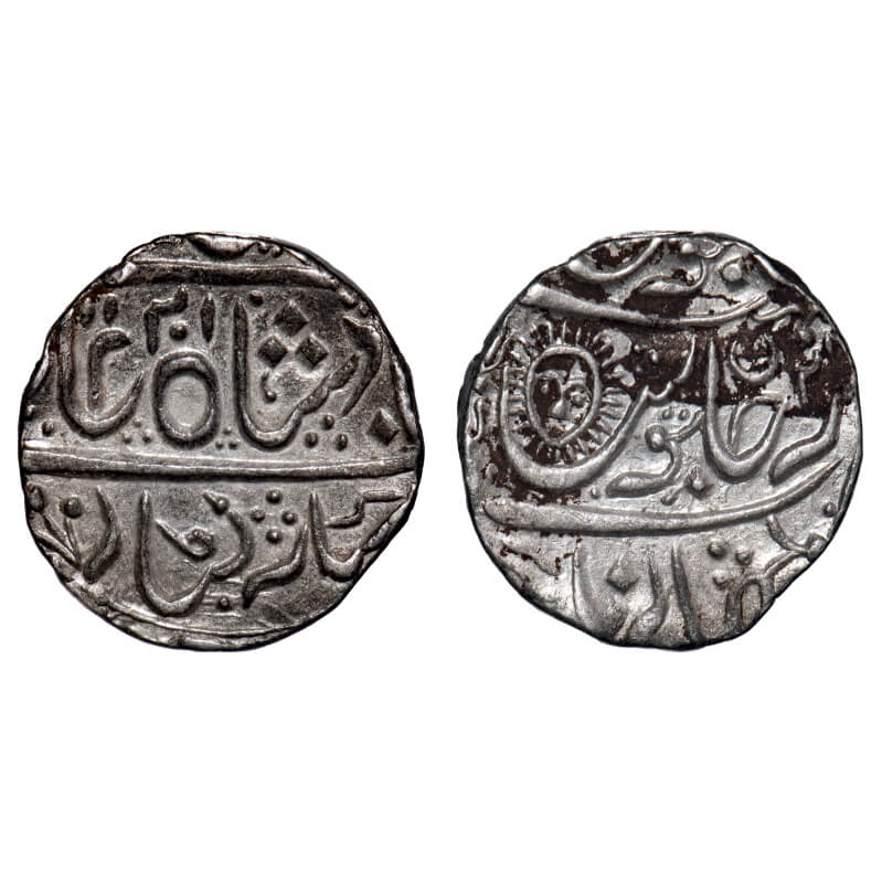 Indore, Silver Rupee, 11.23g, Ahalya Bai , Malharnagar Mint, AH 1201/18 RY, INO Shah Alam II. Sunface and crescent on revese, complete mint visible. Broad flan. KM 76. Extremely Fine + details. Scarce.