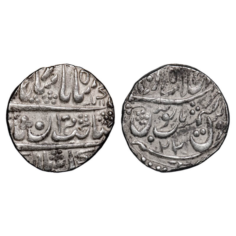 | Jaisalmir, Silver Rupee, 11.28g, Ranjit Singh (AH 1263-1281/1846-1864 AD), Akhey Shahi, INO Muhammad Shah, AH 11xx/Frozen 22 RY, without bird variety. KM 5.1 type. Extremely Fine, Scarce. |