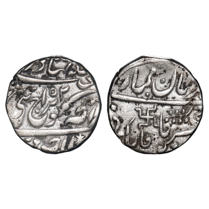 | Jodhpur, Silver Rupee, 11.38g, Dar ul Masur Jodhpur (pseudo Pali) Mint, INO Queen Victoria & Takht Singh (1843-1873 AD), (RY 16 & inverted 45), Sword, Jhar & Swastika on reverse. KM 187/J.Lingen P.07.2.06 Type. Very Fine+, Scarce. |