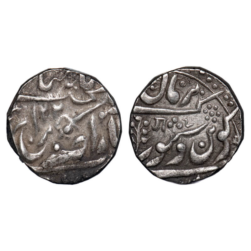 | Jodhpur, Silver Rupee, 11.37g, Takht Singh (1843-1873 AD), Jodhpur Mint, 22 RY INO Queen Victoria, with the additional Daroga mark 'ga' reading near jhar on obverse, sword on reverse. J.Lingen P 07.2.06. Very Fine, Rare. |