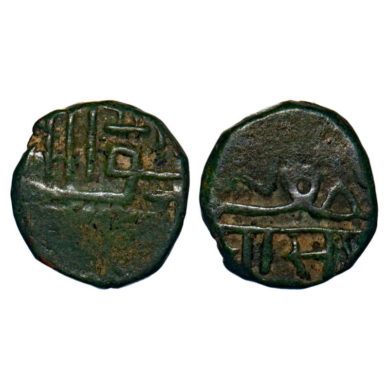 Junagadh, Copper Falus, 7.52g, Local ruler Amin khan Ghuri, Obv: (Shri) Amin shah in nagari legend below muzaffar, Rev: usual persian script. Refer article by Dr. Kishorechandra B. Pathak, in gujarat sashodhan trimasik january 2012. KM Unlisted. Fine, Extremely Rare