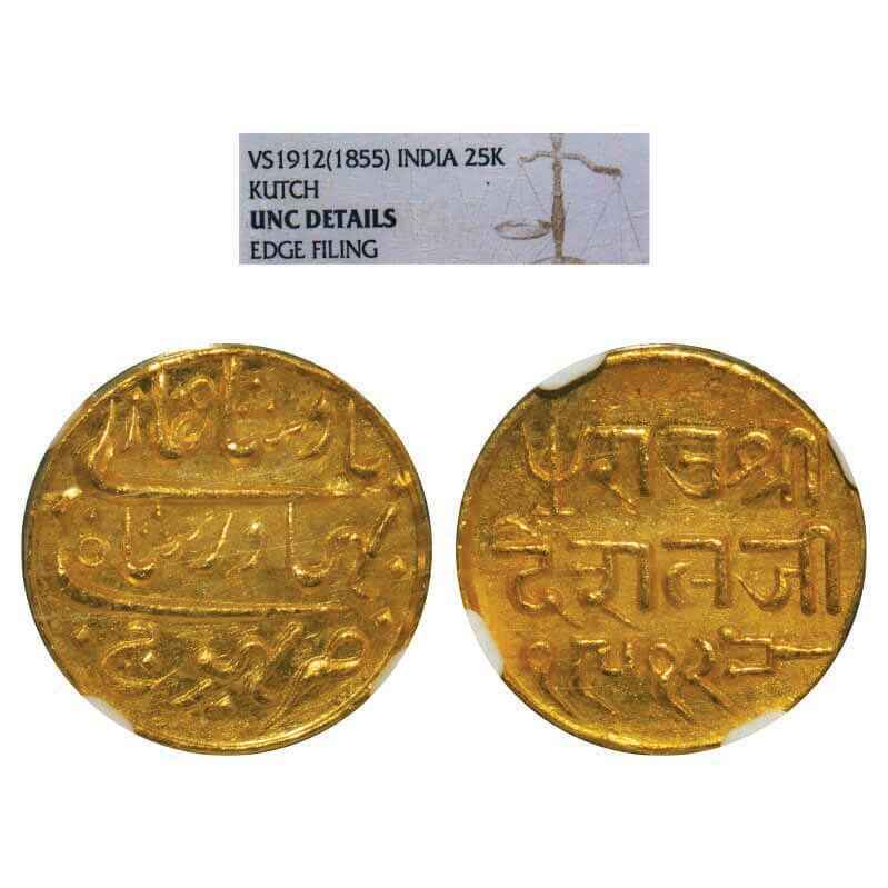 Kutch, Gold Kori, 4.66g, Deshalji II, Bhuj Mint, INO Bahdur Shah II, VS 1912. Rajgor 162.2. NGC graded UNC Details Edge Filing. Very Rare.
