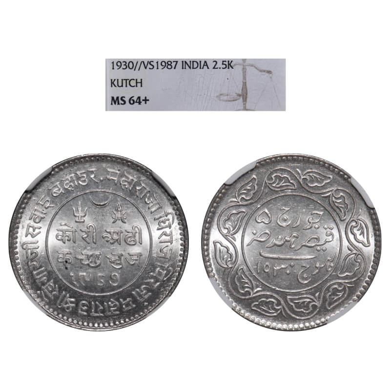 Kutch, Silver, 2 ½ Kori, Khengarji III, INO George V, VS 1987/1930 AD. Edge: KUTCH BHUJ reads clock wise seeing from obverse on top, Rajgor 232.29. NGC graded MS 64+. Scarce.