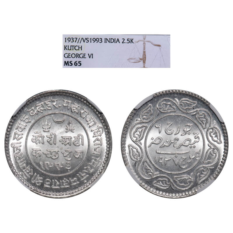 Kutch, Silver, 2 ½ Kori, Khengarji III, INO George VI, VS 1993/1937 AD. Edge: KUTCH BHUJ reads clock wise seeing from reverse on top. Rajgor 254.1 variety of edge. NGC graded MS 65. Very Scarce.