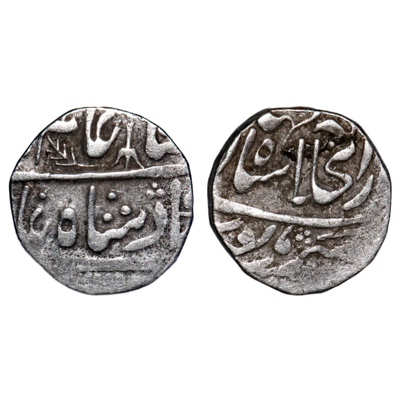 Mewar Feudatory Shahpura, Silver Rupee, 10.64g, INO Shah Alam II, Pseudo mint name dar ul Khilafat Shahjahanabad, inverted trident and leaf as mark on obverse top. KM 12 unlisted type. Very Fine, Scarce.