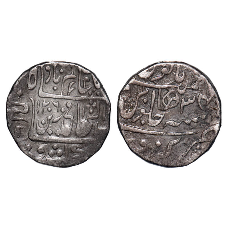 | Narwar, Silver Rupee, 10.90g, Narwar Mint, struck by Kachhwaha Raja of Narwar as tributary of Mahadji Rao Sindhia (AH 1175-1209 / 1761-1794 AD), AH 1206/34 RY, INO Shah Alam II, lotus bud on rev, KM 20. Toned, Very Fine, Scarce. |