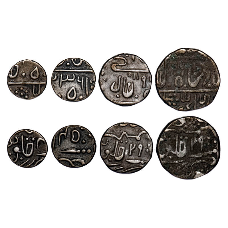 | Partabgarh, Silver Rupee, ½, ¼, 1/8 (4 Coins), British Protectorate issues and Dulep Singh (AH 1241-1281, 1825-1864 AD), INO Shah Alam II, AH 1199/29, 1236/45 RY. KM 13,12,23 11 . Very Fine, Very Scarce. |