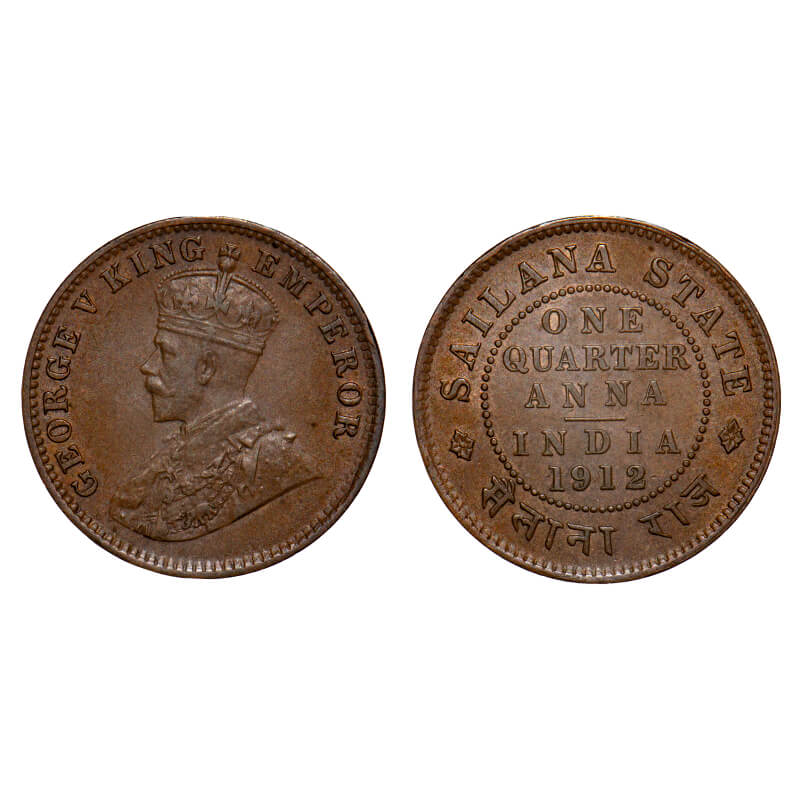 Sailana, Copper ¼ Anna, 4.86g, Jaswant Singh (1890-1919 AD), 1912 AD, bust of George V on obv. KM 16. Toned About Uncirculated, Scarce.