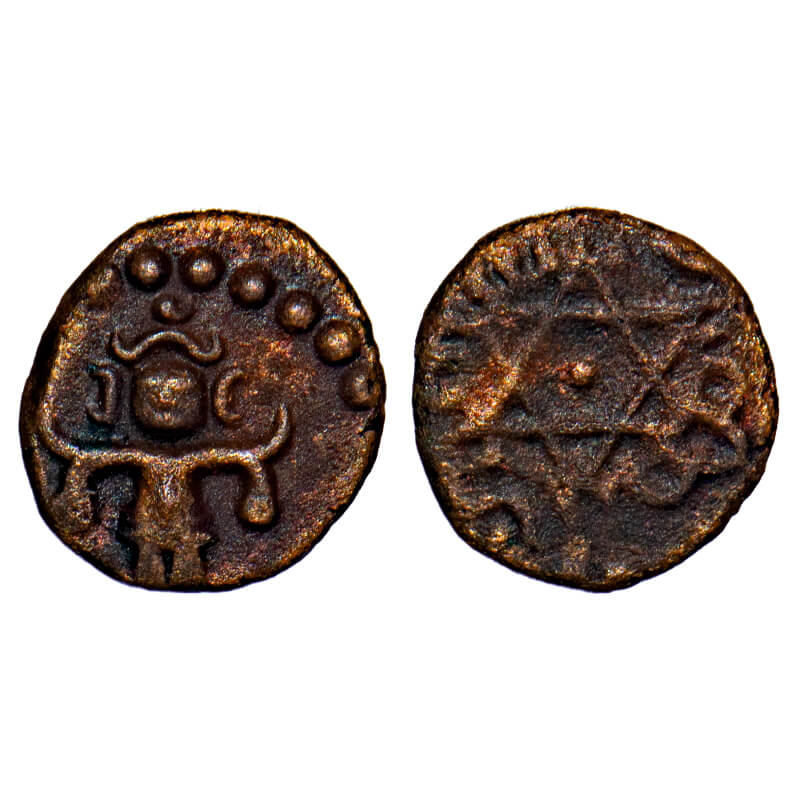 Travancore, Copper Cash, 0.77g, Ayilyam Thirunal Rama Varma (1860-1880 AD), Obv: Sree Krishna standing butter in both hands, Rev: Sudarsana chakram. BS 208 type, A series. Extremely Fine, Rare.