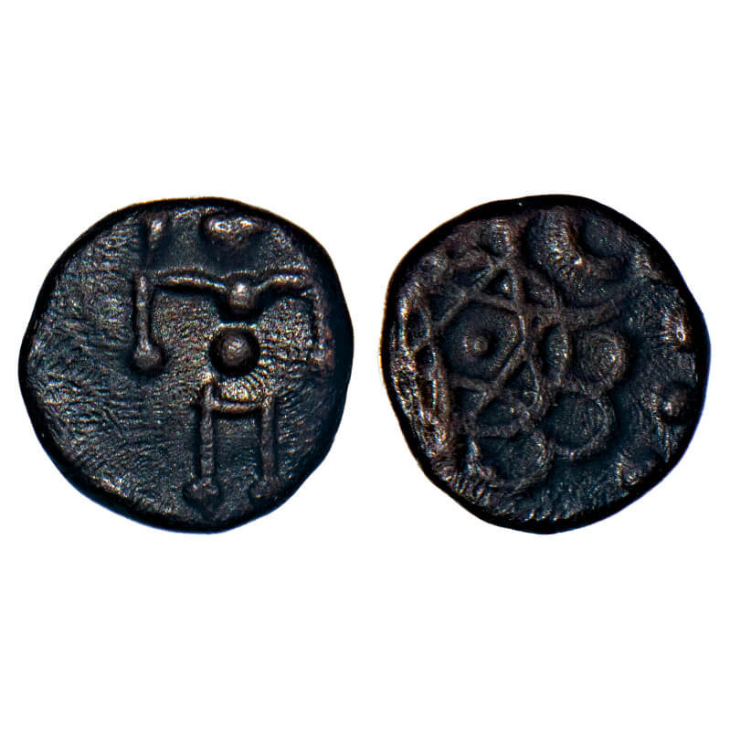 Travancore, Copper Cash, 0.73g, Ayilyam Thirunal Rama Varma (1860-1880 AD), Obv: Sree Krishna standing butter in both hands, Rev: Sudarsana chakram. BS 209 type, B series. Extremely Fine, Rare.