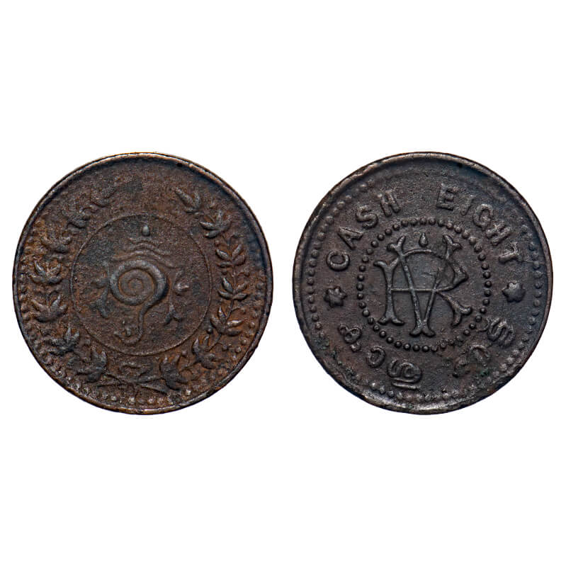 Travancore, Copper Cash Eight, 5.03g, Rama Verma VI (ME 1062-1101/1885-1924 AD), struck during 1901-1910 AD, RV monogram, Cash Four & cash Eight. KM 42/Beena Sarasan 228 type. About Very Fine, Scarce.