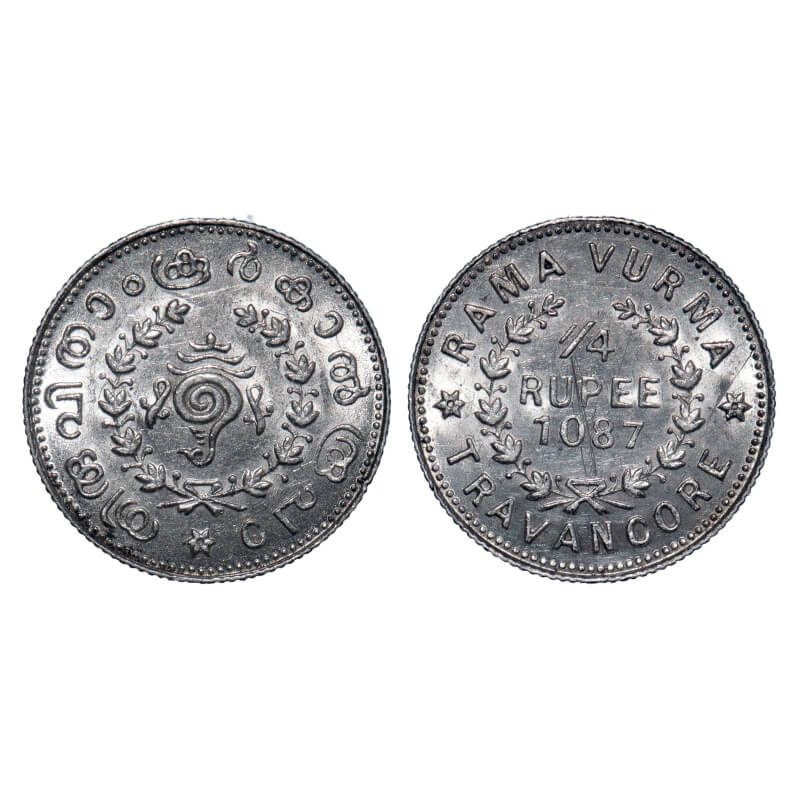 Travancore, Silver, ΒΌ Rupee, 2.76g, Rama Varma VI (ME 1062-1101 / 1885-1924 AD), ME 1087, San Serif FontVariety. KM 52/Beena Sarasan 244 type. Uncirculated, Rare.