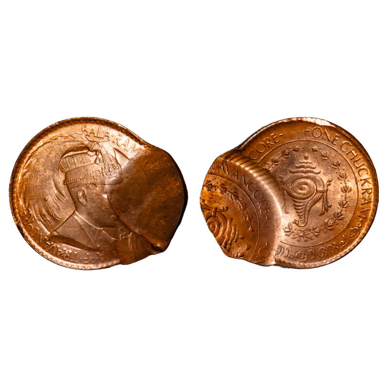 | Travancore, Bronze Chuckram, 7.79g, Bala Rama Varma II, ND type, Error, Double struck, Conch & Portrait Type. KM 60a Type. Uncirculated, Rare. |