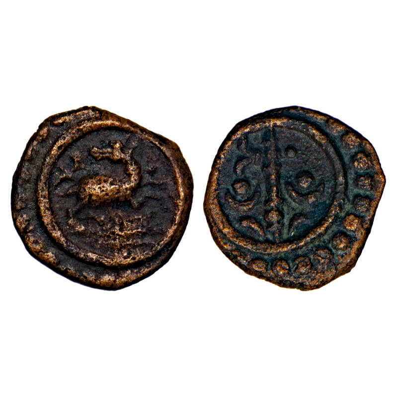 Travancore, Copper Thira Cash, 1.47g, Obv: Deer to right head turned back, Rev: stylised battle axe flanked by sun and crescent. within dotted borders both sides. BS 312.1 type. About Very Fine, Very Scarce.