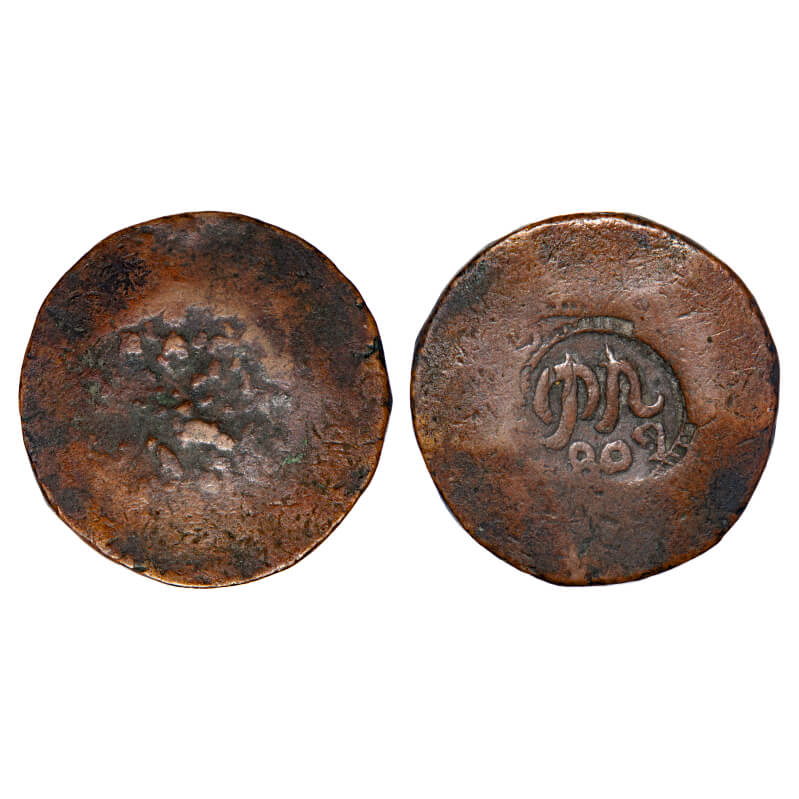 | Indo Portuguese, Copper Tanga (60 Reis), 36.22g, D.Miguel (1828-1834 AD), ND, Goa issue, Obv: Crest, Rev: Counter struck PR 809 (Portaria Registada 809) on 60 reis. A.Gomes (page 594) 07.05 type, KM 253. About Very Fine+, Scarce. |