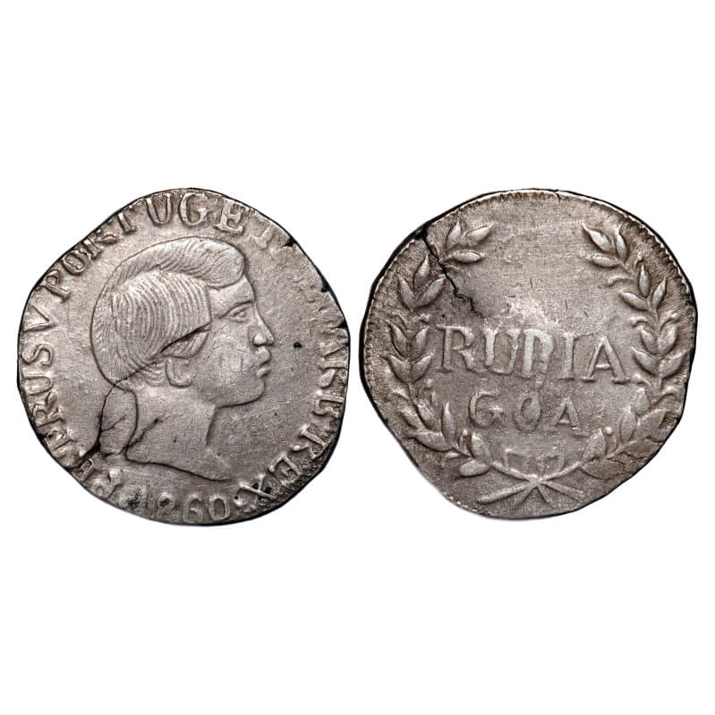 | Pourtuguese India, Silver Rupia (600 Reis), 10.85g, D. Pedro V (1853-1861 AD), 1860 AD, Goa issue, Obv: Bust & date, Rev: Denomination and mint, die crack seen. A.Gomes (page 601) 09.05 / KM 279. Very Fine+, Rare. |