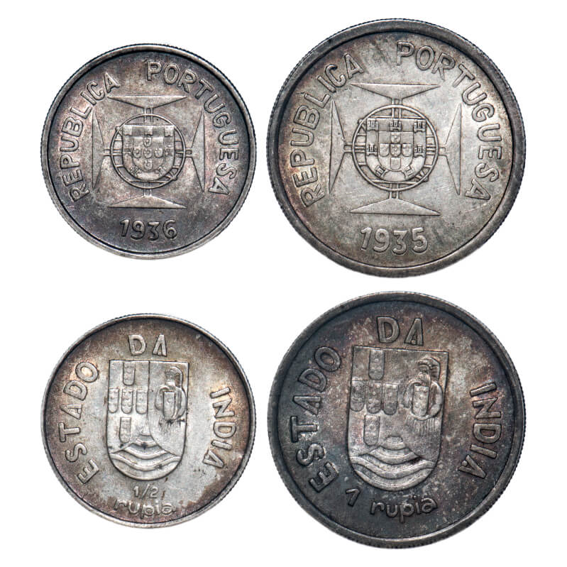 | Indo Portuguese, Silver Rupee & ½ Rupee (2 coins), 11.58 & 5.77g, Republic (1910-1961 AD), 1935, 1936(cleaned) AD. A.Gomes (page 605, 606) 07.01, 10.01 / KM 22, 23. Toned Uncirculated, Scarce. |
