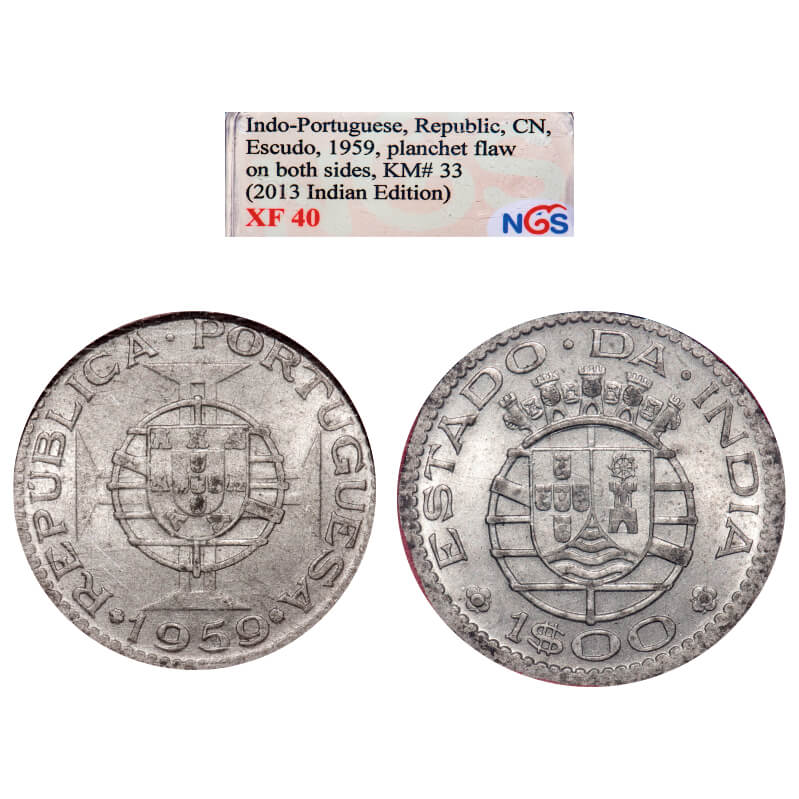 Indo Pourtuguese, Copper Nickel, Republic, 1 Escudos 1959 AD. error- planchet flaw on both sides A.Gomes (page 606) 16.02 / KM 33. NGS graded XF 40, Scarce.