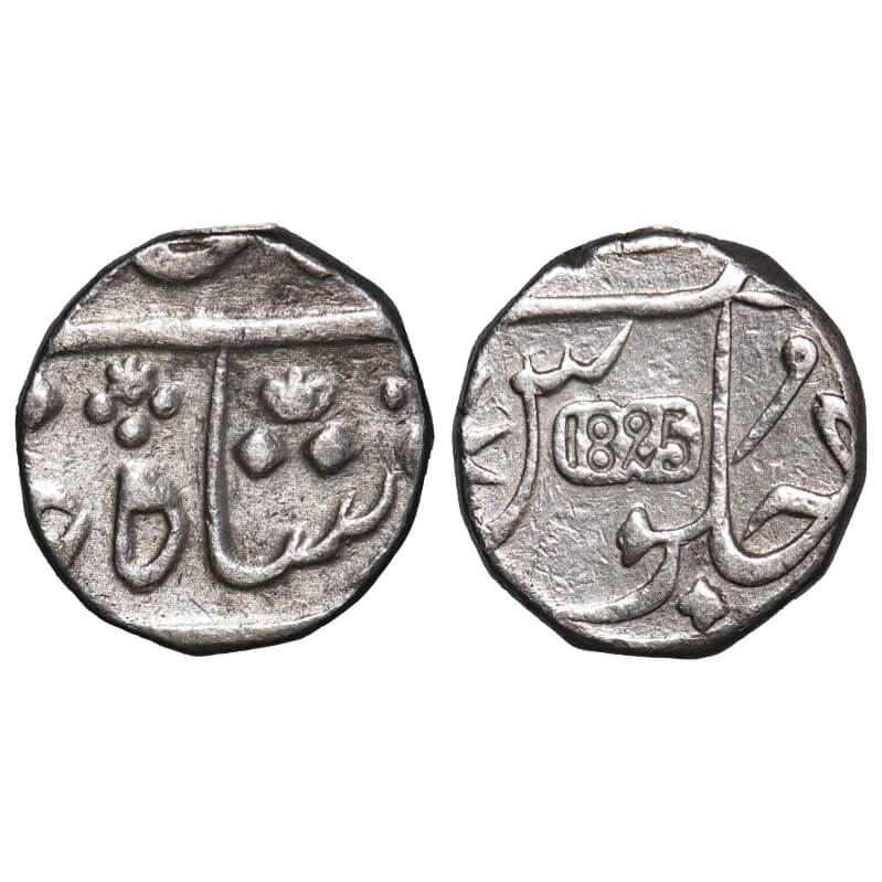| Bombay Presidency, Silver 1/2 Rupee, 5.77, Surat Mint, INO Shah Alam II, 46 RY, Crown on obverse, 1825 overstruck on reverse. P.Stevens (Page 248) 3.22 / F. Prid 277. Extremely Fine, Very Rare. |