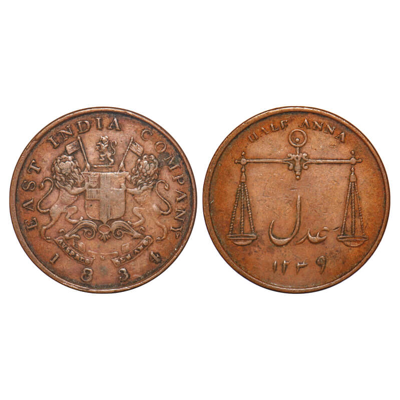 | Bombay Presidency, Copper, Half Anna, 12.73g, (1834 AD / 1249 AH), letters 1.2mm, Obv: Arms of East India Company and date, Rev: Scales with Adil between the pans and Adl.P.Stevens (Page 271) 5.31/F. Prid 217. Very Fine, Scarce. |