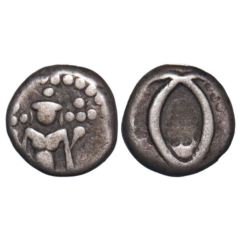 Madras Presidency, Silver Double Fanam, 1.74g, (1764-1807 AD, 3rd Issue), Obv: A single diety (Vishnu), Rev: C's interlinked. P.Stevens (Page 358) 1.24/F.Prid. 18. Very Fine, Very Rare.