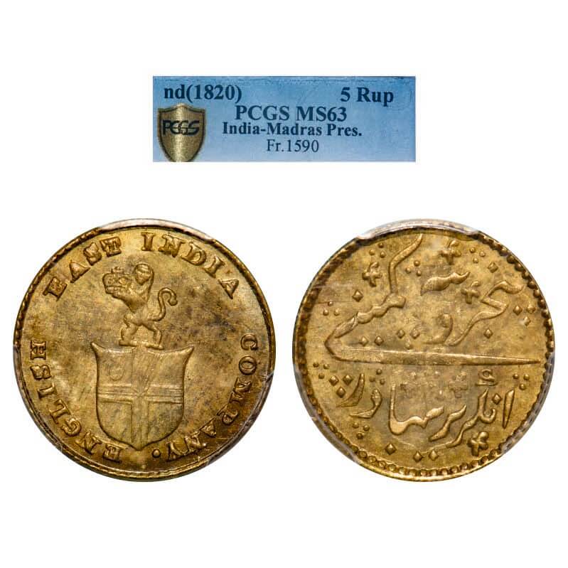 Madras Presidency, Gold 5 Rupees/ 1/3rd Mohur, 3.86g, 1820 AD issue. Obv: Company's arms without supporter and motto. ENGLISH EAST INDIA COMPANY Rev: Persian legend Panj Rupia Kampani Angrez Bahadur. Edge grained. P.Stevens (Page 489) 4.4/ PR 244. PCGS graded MS 63, Very Rare.