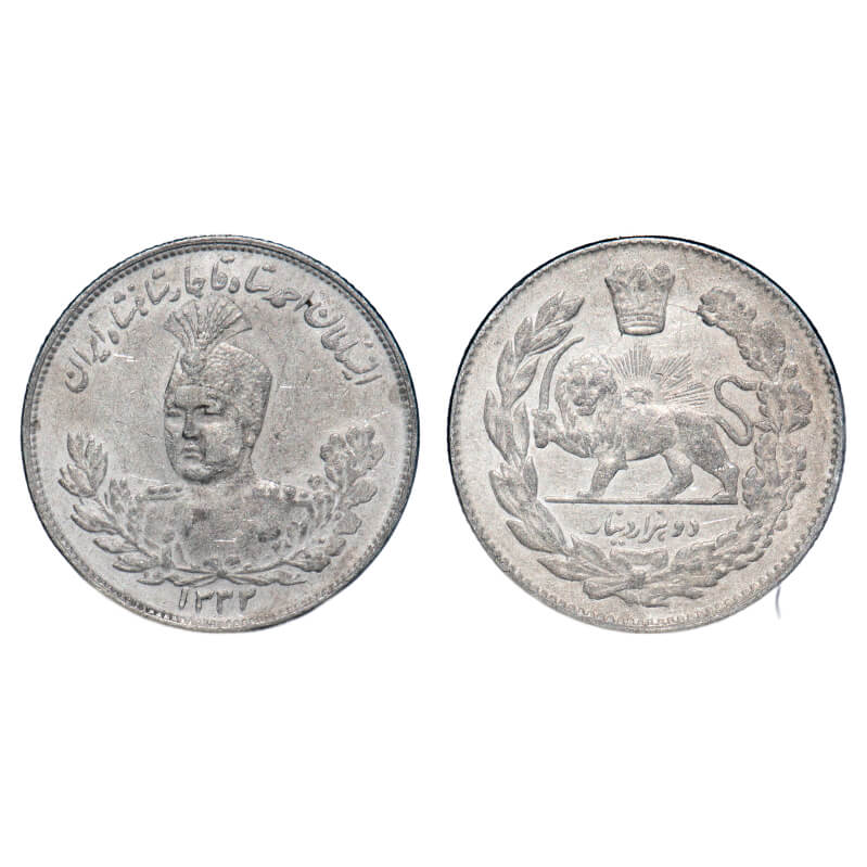 | Iran, Silver (0.900 silver) 2000 Dinars (2 Kran), 8.95g, Sultan Ahmad Shah (AH 1327-1344/1909-1925 AD), AH 1332 (1913), with multiple errors on both sides, die clash on obv & die crack on rev, Obv: Uniformed bust 3/4 left within wreath, date below, Rev: Radiant lion holding sword within crowned wreath. KM 1057. About Extremely Fine, Scarce. |