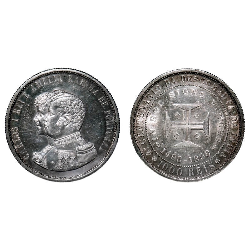 Portugal, Silver 1000 Reis (0.917% Silver), 24.79g, 1898, 400th Anniversary Discovery of India. Obv: Portrait of King Carlos And Queen Amelia, Rev: Cross design within circle. KM 539. Toned About Uncirculated. Scarce.