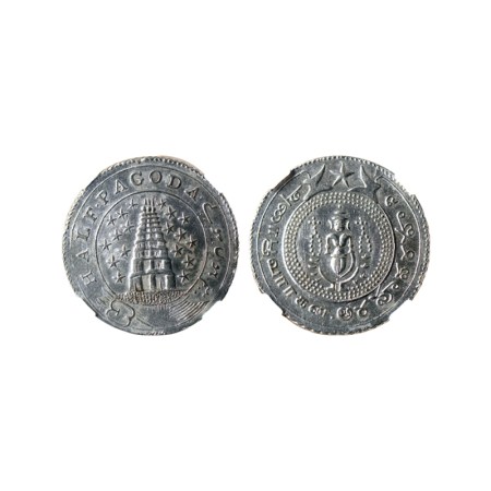 Madras Presidency, Silver Half Pagoda, 20.64gm, (1808 AD 2nd Issue), Obv: Gopuram of temple with stars either side, on a ribbon, the ends seperated by a star the value in HALF PAGODA, 9 stars each side, Rev: The diety Vishnu surrounded by dotted circles the value around in in tamil ' Arai pu vara kun', and in Telugu 'Arai pu vara hun'. F.Prid 169. NGC slabbed AU details surface hairlines.