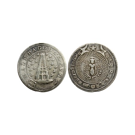 Madras Presidency, Silver Quarter Pagoda, 10.68gm, (1807 AD 1st Issue), Obv: Gopuram of temple with stars either side, on a ribbon, the ends seperated by a star the value in HALF PAGODA, 11 / 1 / 11 stars each side, Rev: The diety Vishnu surrounded by dotted circles the value around in in tamil ' Arai pu vara kun', and in Telugu 'Arai pu vara hun'. F.Prid Unlisted.