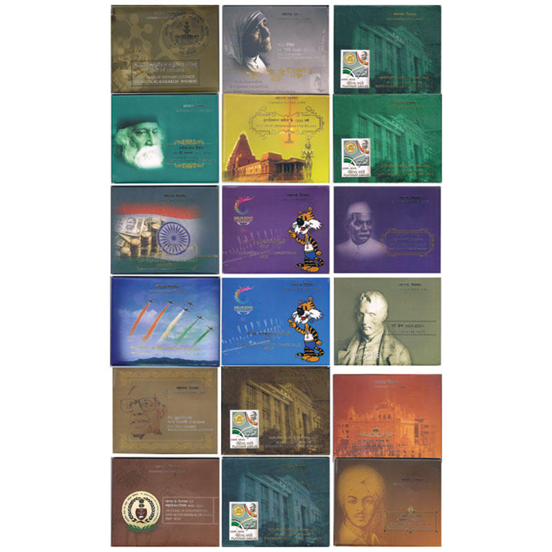 UNC Coin sets, (18 Pcs lot), Shaheed Bhagat Singh Birth Centenary 2007, Rupees 5 (1), Ter-Centenary of Gur-Ta-Gaddi of Guru Granth Sahib 2008. Rupees 5 (1), Sir Louis Brailee - 2009, Rupees 2 (1), Dr Rajendra Prasad 125 Birth Anniversary - 2009, Rupees 5 (1), Platinum Jubilee of Reserve Bank of India - 2010, Rupees 1, 2, 5, 10 (4), XIX Commonwealth Games Delhi - 2010, Rupees 2, 5 (2), 1000 Years Brihadeeswara Temple - Rupees 5 (1), Mother Terasa Birth Centenary - 2010, Rupees 5 (1), 150 Years of comptroler -2010. Rupees 5 (1), C. Subramanium - 2010, Rupees 5 (1), 150 Years of Income Tax - 2010, Rupees 5 (1), Civil Aviation - 2011, Rupees 5 (1), Rabindranath Tagore - 2011, Rupees 5 (1), 110 Years of Indian council of Medical Research - 2011, Rupees 5 (1). All in Blister Pack, Scarce.