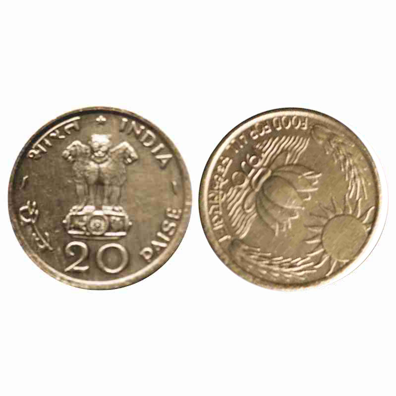 20 Paise, Aluminium-Bronze, 1970, Calcutta Mint, Sun & Lotus, Error, Reverse 4 o'clock. Extremely Fine. Rare.
