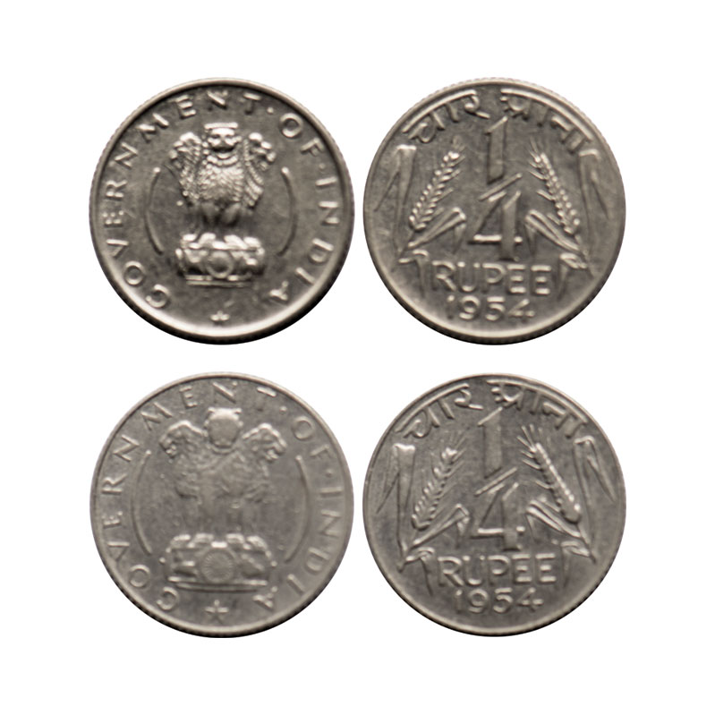 25 Paise, Nickel, (2 Coins), 1954, Calcutta Mint, Die Variety. KM# 5.2 larger date larger Lion, Scarce, KM# 5.3 small Lion. Extremely Fine. Scarce.