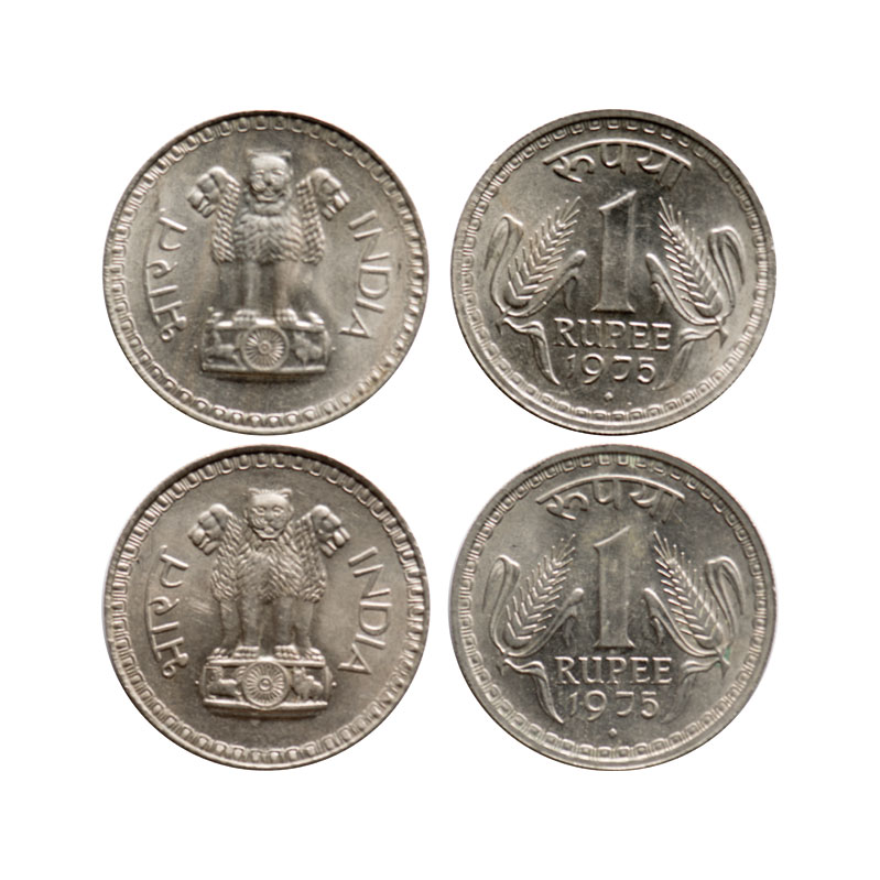 1 Rupee, Copper Nickel, (2 Coins), 1975, Bombay Mint, KM# 78.1 type 1, KM# Unlisted type Central Lion chest hair re-engraved. Extremely Fine to Uncirculated, Scarce.