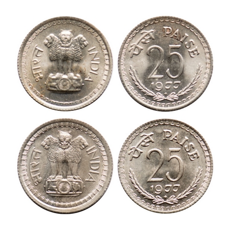 25 Paise, Copper Nickel, (2 Coins), 1977, Bombay Mint, Die Variety. KM# 49.2, type 2, small Lion, KM# 49.4 type 1, big Lion, Scarce. Almost Uncirculated. Scarce.