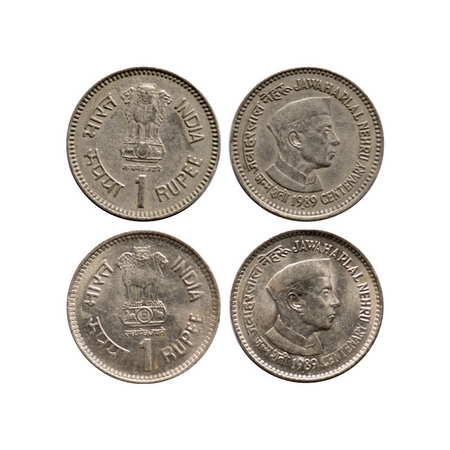 1 Rupee, Copper Nickel, (2 Coins), 1989, Bombay Mint, Jawaharlal Nehru. KM# 83.1, KM# 83.2 Proof die Obverse, Scarce. Very Fine to Almost Uncirculated. Scarce.