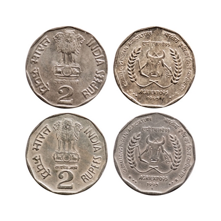2 Rupee, Copper Nickel, (2 Coins), 1995, Agriculture Expo, Bombay Mint, Die Variety, Type A & B. Very Fine, Scarce.